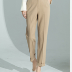 Design: O pereche relaxată de pantaloni de lucru cu talie înaltă, având o croială lejeră, pliseuri ajustate și un design minimalist. Silueta elegantă, dar confortabilă, îmbină confortul cu eleganța profesională.