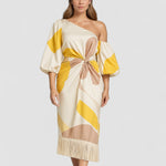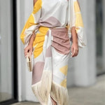 Caracteristici speciale: Franjuri la margine, design asimetric pe un umăr și model artistic elegant.