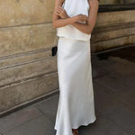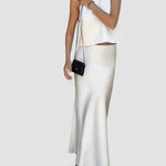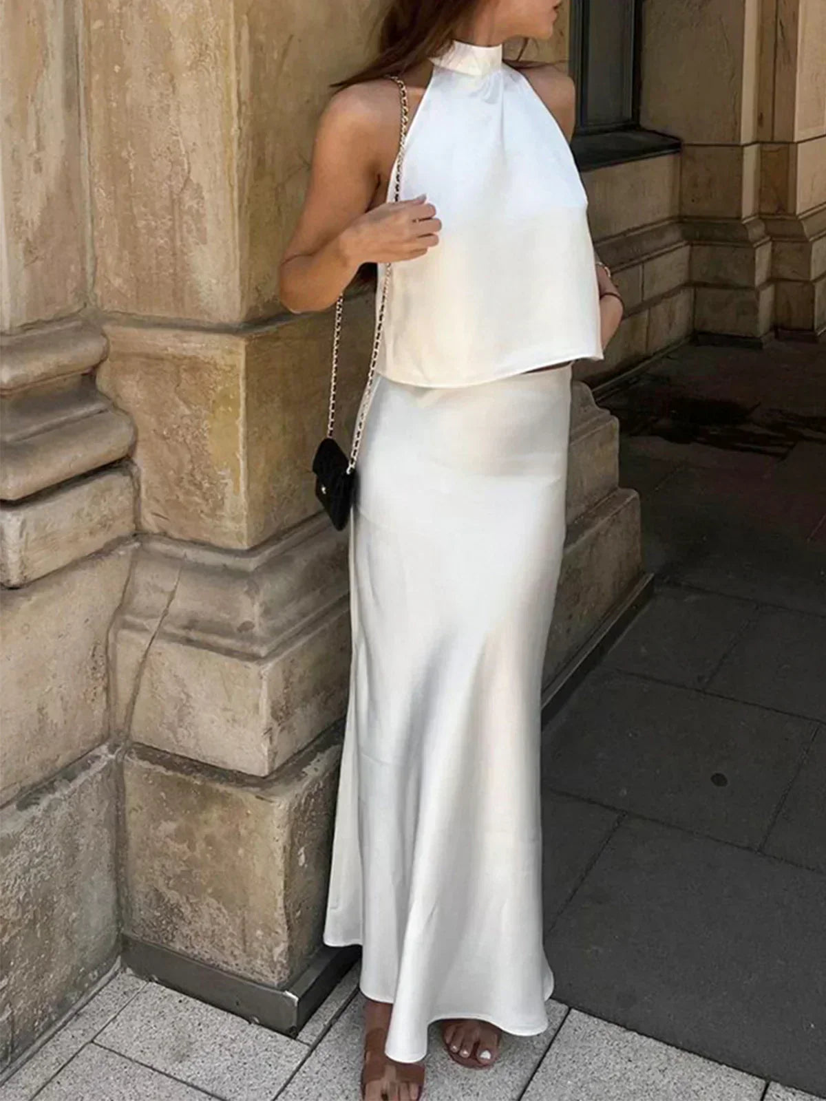 Design: Un set rafinat din două piese, cu un top scurt elegant din satin cu un design cu spate deschis, asociat cu o fustă maxi fluidă cu talie înaltă. Țesătura luxoasă și silueta minimalistă emană o sofisticare fără efort.