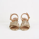 Step into refined elegance with the Only Lovers golden leather sandals. Crafted from premium golden leather, these sandals showcase a charming ruffle detail on the front, adding a romantic touch to their timeless design. An adjustable ankle strap with a sleek metal buckle offers a tailored fit, while the natural leather lining provides comfort for all-day wear. The 5.5 cm block heels offer a balanced, stylish lift, and the beige sole completes the look with subtle sophistication.