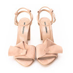 The Trick Me nude suede sandals by Mihaela Glavan blend soft, nude suede leather with classic design elements. These sandals feature a comfortable 9 cm block heel, providing both height and stability for any occasion. The ankle strap ensures a secure fit, while the delicate bow detail adds a touch of feminine charm. These features combine to create a sandal that's not only stylish but also practical for all-day wear.