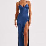 - Detalii: Fisură înaltă pe coapsă, spate deschis, bretele ajustabile