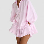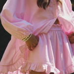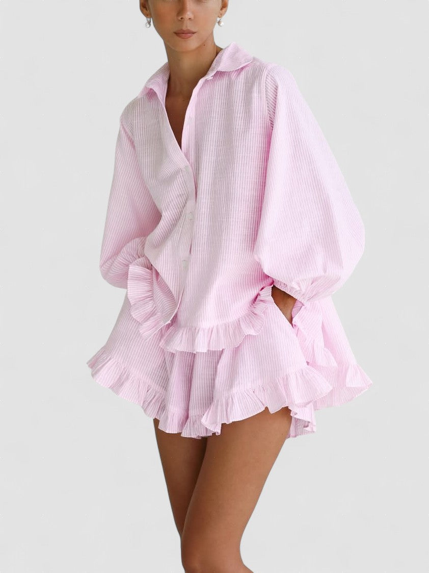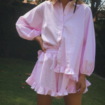 Setul Ava de Eleganță Jucăușă cu Volane este combinația perfectă între farmec și stil fără efort. Cu mânecile sale voluminoase și accentele jucăușe de volane, acest duo de top și pantaloni scurți aduce o vibrație lipsită de griji zilei tale. Fie că te relaxezi, iei brunch sau ieși la o plimbare în vreme caldă, acest set oferă confort cu o notă de declarație.
